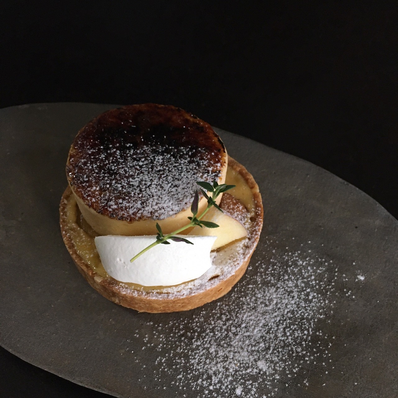 キャラメリゼしたりんごを焼き込んだタルト生地の上に、ふわふわのバニラムースをのせ表面をキャラメリゼしました。