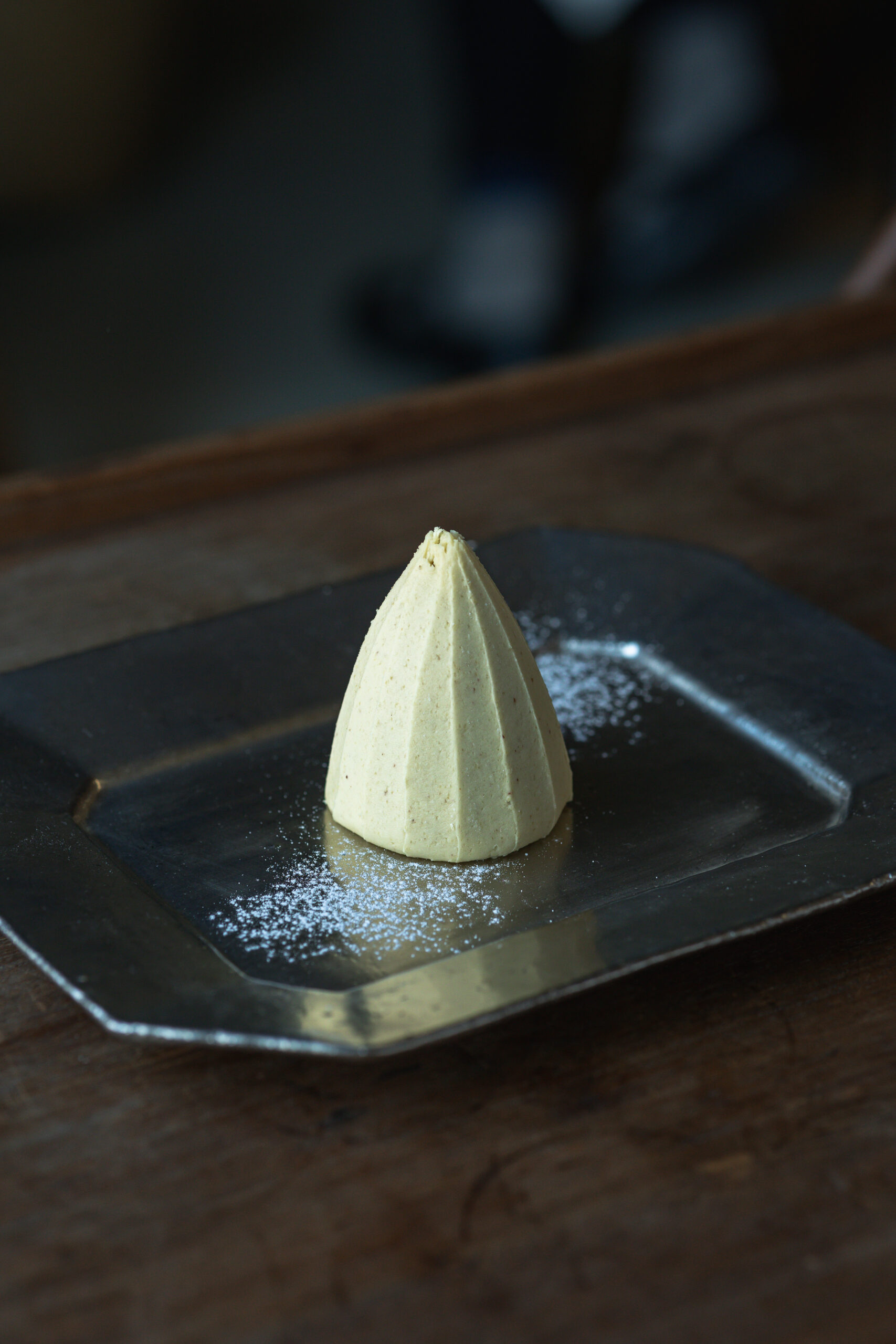 メレンゲの上にスポンジ、生クリーム、そら豆で作ったクリームでお山の形に仕上げました。