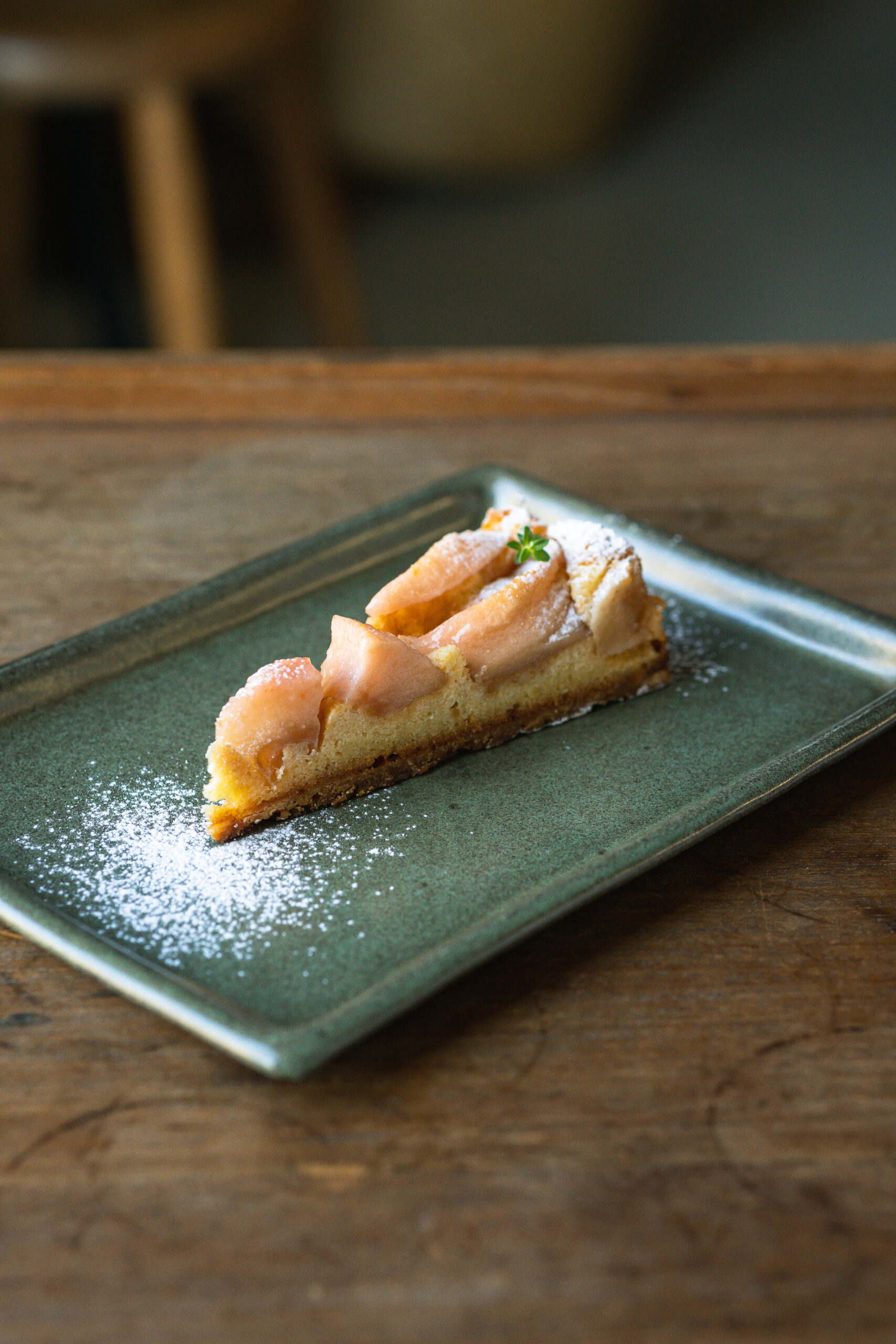 甘酸っぱい紅玉りんごをコンポートにしてアーモンドクリームと香ばしく焼き上げた優しい甘さの秋のタルトです。
